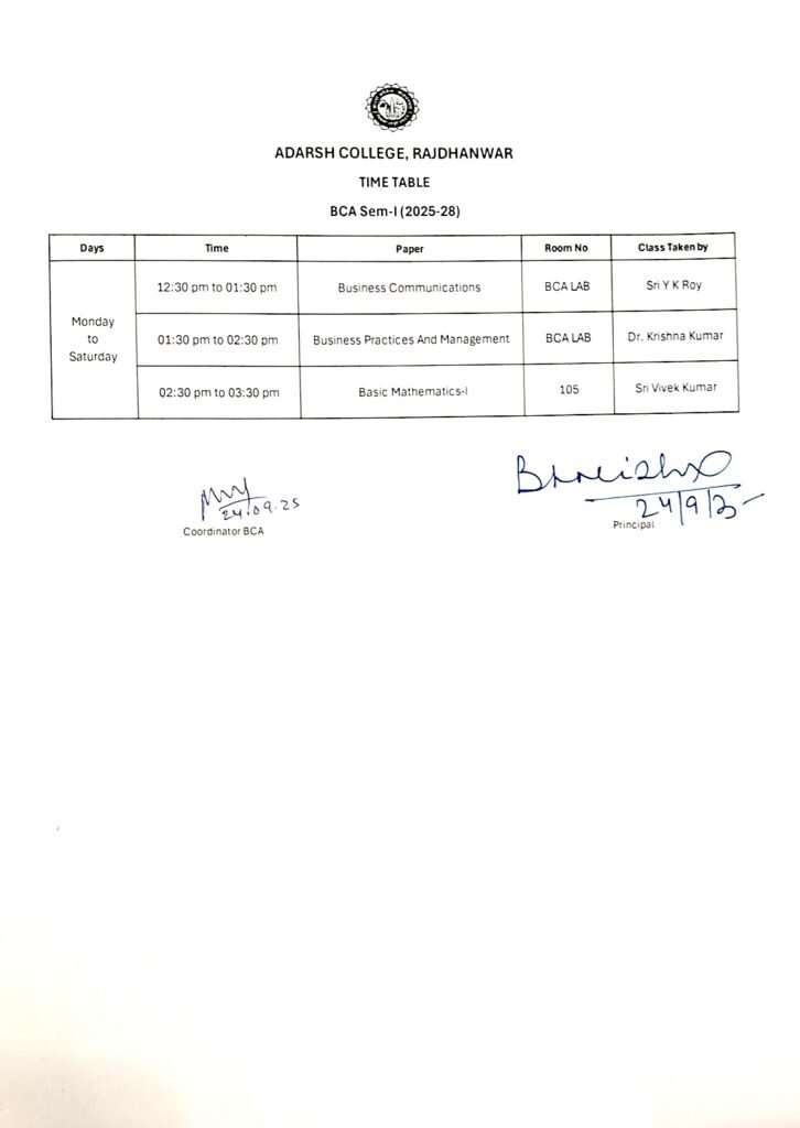 Time Table (BCA) September 24, 2025September 24, 2025 Pradeep Kumar Rana Share this:Share Click to share on Facebook (Opens in new window) Facebook Click to share on WhatsApp (Opens in new window) WhatsApp Click to share on X (Opens in new window) X Click to share on Telegram (Opens in new window) Telegram Like this:Like Loading...